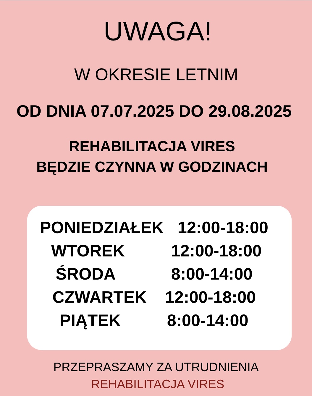 ZMIANA GODZIN OTWARCIA W WAKACJE !
